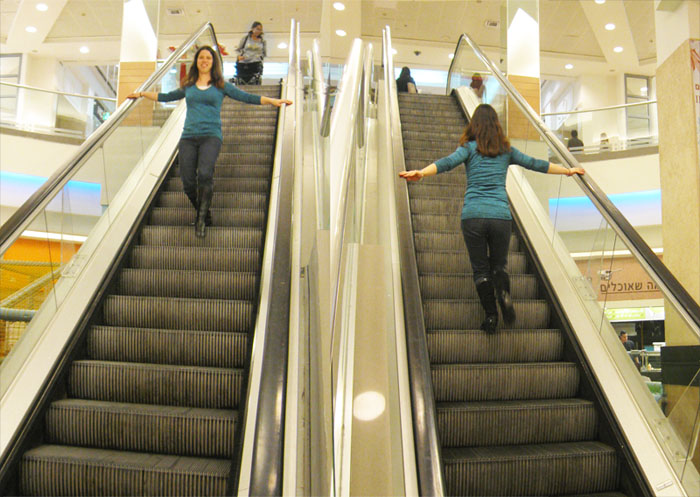 כשהדרגנוע עומד, מצליחות פזיתי ואחותה התאומה פזיקי (הזהה לה בכל) לרדת מהר יותר מאשר לעלות. נערכת תחרות: פזיתי עולה ויורדת בדרגנוע עולה, ופזיקי עולה ויורדת בדרגנוע יורד.