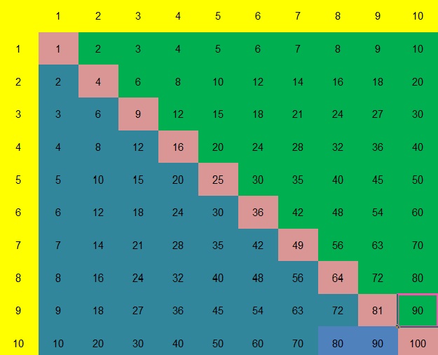 המספרים הנמצאים במשבצות סימטריות הם זהים, דבר שנובע מתכונת החילופיות של הכפל: xy=yx, שמשותפת גם לחיבור: x+y=y+x.