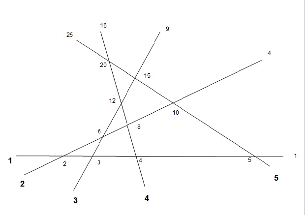 מאחר שמסובך לצייר עשרה ישרים, נדגים זאת בלוח כפל של 5*5. בקצה אחד של כל ישר נרשום את הספרה שהוא מייצג ובקצה השני את המספר בריבוע כפי שהוא מופיע באלכסון – ובנקודות החיתוך את תוצאת המכפלה של שני הישרים שנחתכים בהן: