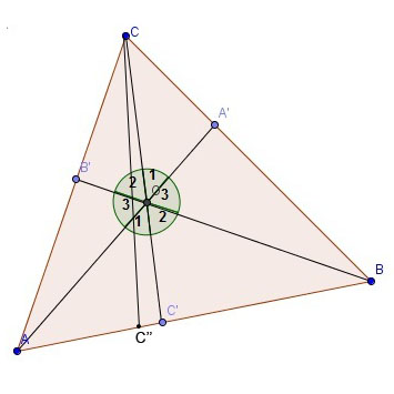 ולאחר צמצומים נקבל שהמכפלה שווה ל-1 והנה הוכחנו את ה”אם“. עתה נוכיח בדרך השלילה את ה”רק אם“. נסמן שלוש נקודות על הצלעות שמכפלת מנותיהן היא 1 ונמתח אלכסונים מקודקודי המשולש אל הנקודות בהתאמה. נניח שהשלושה אינם נפגשים בנקודה אחת ולכן נעביר אלכסון נוסף, CC”, דרך נקודת המפגש AA’, BB’.