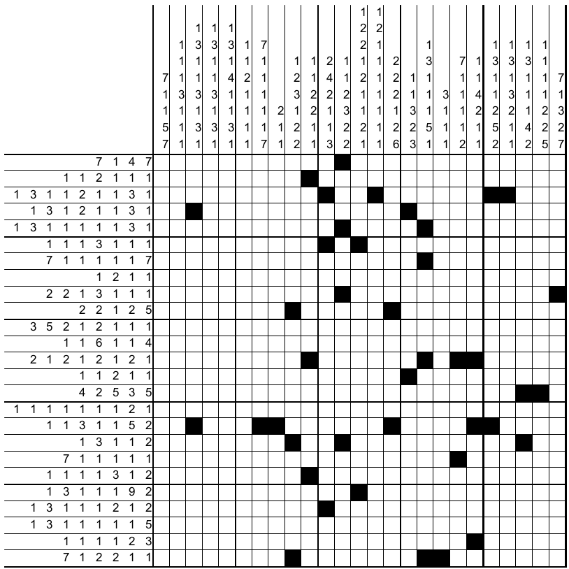 זוהי חידת “שחור ופתור”. בחידות כאלו כל משבצת בטבלה היא לבנה או שחורה. פתרון החידה מגלה תמונה חבויה.