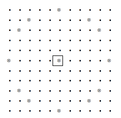 ב. בסריג ישנן 12 נקודות במרחק אווירי של חמישה קילומטרים מהתחרות. את הנקודות האלה אפשר למצוא בעזרת שתי האפשרויות להציג את המספר 52 כסכום של שני ריבועים של מספרים שלמים: 52=32+42 או 52=52+02.