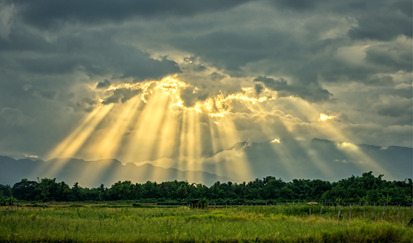 توليفة الشّمس عند زاوية منخفضة مع السّحب تسطّر لوحات طبيعيّة مذهلة، حيث تنفذ أشعّة الشّمس من خلال الغيوم، مضيئةً سطح الأرض بزوايا متنوّعة. أشعّة الشّمس في حقل أرزّ في تايلاند. | Shutterstock, Parinya Feungchan