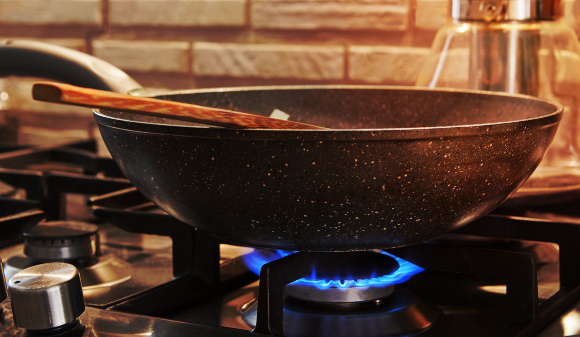 يمكننا الطّهي بفضل نقل الحرارة من الموقد إلى المقلاة، أي نقل الطّاقة بسبب اختلاف درجات الحرارة بين الأجسام. مقلاة على الموقد| تصوير: ulianiculaie, Shuterstock