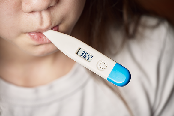 حتّى قياس الحرارة البسيط يعتمد على قانون ديناميكيّ حراريّ ليس بهذه البساطة. فتاة لديها مقياس حرارة في فمها | تصوير: Tagwaran, Shutterstock
