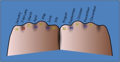 الطّريقة الأسهل لمعرفة الشّهور الّتي تتكوّن من 31 يومًا. ضُمّ أصابع يديك مكوّنًا قبضة اليدين لتكون أمامك. إبدأ العدّ من اليسار إلى اليمين – يُعطى اسم كلّ شهر من الأشهر لمفصل وللفجوة بين المفصلين. الشّهر الواقع على مفصل هو شهر من واحدٍ وثلاثين يومًا، أمّا الباقيات فهي من ثلاثين يومًا عدا عن شهر شباط / فبراير فهو من 28 يومًا أو 29 يومًا (كلّ أربع سنوات).| ويكيبيديا