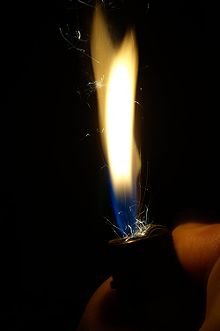 إشعال قدّاحة الغاز (تزويد طاقة التفعيل) بواسطة الشرار المنبعث من احتكاك الفلز. الصورة من ويكيبيديا