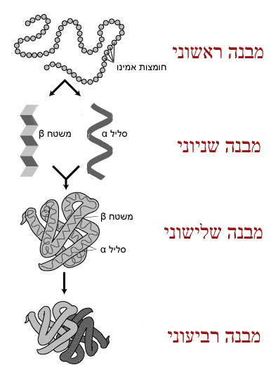 חלבונים הם שרשראות של חומצות אמינו המקודדות על ידי הקוד הגנטי (מולקולות הדנ"א שבגרעיני התאים). שרשרת חומצות האמינו המקודדת על ידי רצף הדנ"א נקראת "המבנה הראשוני של החלבון". חומצות האמינו מתחברות ביניהן בקשרים חזקים מאוד הנקראים קשרים קוולנטיים, שאינם מתפרקים בחימום המתרחש כשאנו מטגנים ביצה. השרשרת הזו מורכבת מאטומי פחמן (C) וחנקן (N) המחוברים ביניהם ברצף קבוע, N-C-C-N-C-C-…-, שמקורו בחלק שנשאר זהה בכל חומצות האמינו שאליו מחובר השייר המשתנה (אותו נהוג לסמן באות R) הקובע את סוג החומצה האמינית.