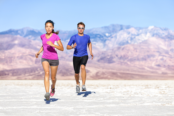 تبخّر العرق فعّال، ضروريّ لخفض درجة حرارة الجسم. رجل وامرأة يرتديان ملابس رياضيّة يركضان في الصحراء | Maridav, Shutterstock