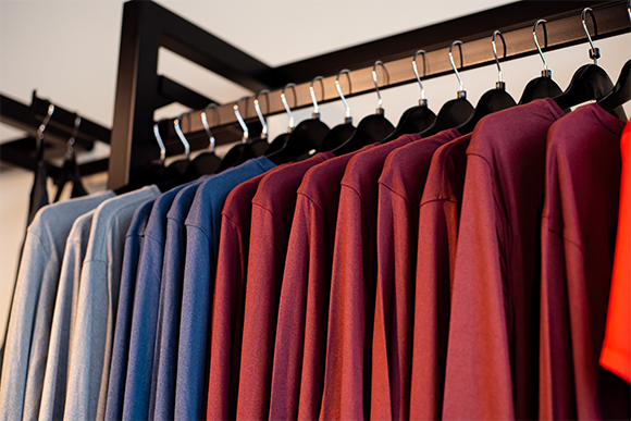 لا تتحلّل الألياف الصناعيّة بسهولة وقد تلوّث البيئة بجزيئات الميكروبلاستيك. قمصان ملوّنة معلَّقة على علّاقة | Trong Nguyen, Shutterstock