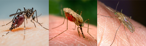 من اليمين إلى اليسار: البعوض المنزليّ، بعوضة الأنوفيليس، وبعوضة النمر |Fabrizio Montarsi / Wikimedia; James Gathany, Pablo Cabrera / CDC