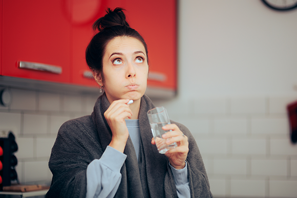 تشير الدّراسات إلى أنّ المثابرة تؤتي ثمارها باستخدام أدوية السّمنة، على الرّغم من أنّه قد تكون هناك آثار جانبيّة غير سارّة في البداية. اِمرأة تفكّر فيما إذا كانت ستتناول الدّواء أم لا | تصوير: Nicoleta Ionescu, Shutterstock