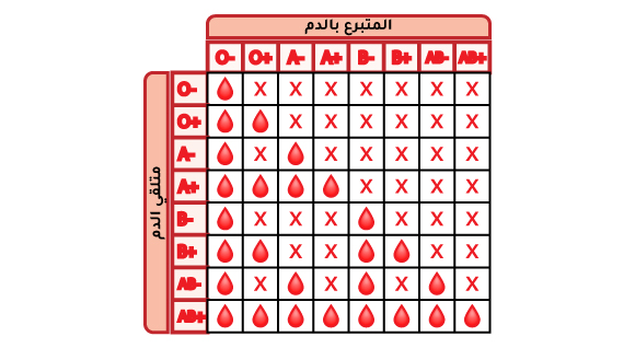 جدول المطابقة بين فصيلة دم المتبرّع والمتلقّي. على سبيل المثال، أصحاب فصيلة الدّم O ناقص يمكنهم التبرّع للجميع| المصدر: Ph-HY, Shutterstock