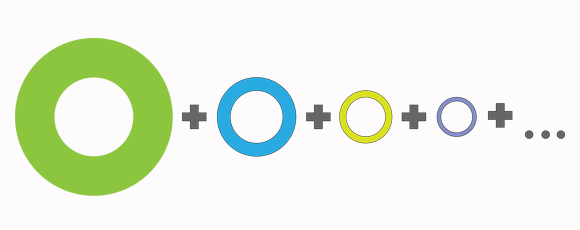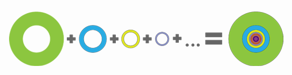 ولحسن الحظّ، يكفي تغيير طفيف في وجهة النّظر حتّى يغدو السّؤال بسيطًا. وهذه المرّة سيكون هناك تغيير حقيقيّ في وجهة النّظر، بالمعنى الحرفيّ قدر الإمكان: بدلًا من النّظر إلى الكعكة من الجانب، سننظر إليها من الأعلى. وفي الأعلى، الكعكة اللانهائيّة الّتي لدينا هي مجرّد دائرة. دائرة واحدة تتلاءَم فيها جميع الحلقات، وتشكّل معًا دائرة واحدة يبلغ نصف قطرها مترًا واحدًا، مثل الطّبقة الأولى.