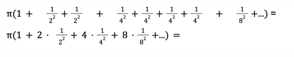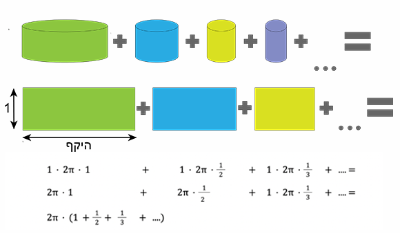 عندما نقوم بتقطيع غلاف الأسطوانة سنحصل على مستطيل. في حالتنا، ارتفاع كلّ مستطيل هو نفس ارتفاع كلّ طبقة من طبقات الكعكة – متر واحد. طول كلّ مستطيل من هذه المستطيلات هو محيط الدائرة، وهو ما يساوي حاصل ضرب ضعف باي في نصف قطر الدائرة. وكما هو معروف، أنصاف الأقطار هي 1، ½، ⅓، إلخ. لذلك نحصل على:
