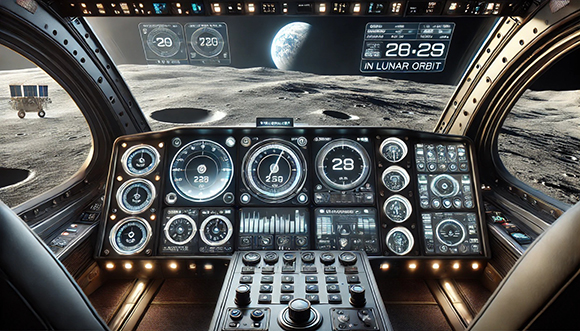 بعض المقادير هي قيم مطلقة، وبعضها نسبيّ. لا تهمّنا سرعة دوران القمر حول الأرض عندما ندور حوله. قُمرة قيادة مركبة فضائيّة في مدارها حول القمر| المثال التوضيحيّ بواسطة DALL-E