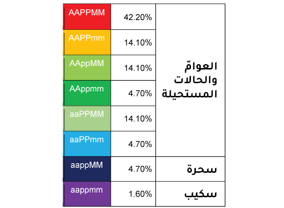 التوليفات الممكنة للجينات الثلاثة AaPpMm x AaPpMm: