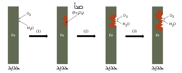 - يَصِلُ الأكسجينُ والماءُ إلى المناطقِ المكشوفةِ، ويستمرُّ الصّدأُ بالتّكوُّنِ والانتشارِ في الحديدِ حَتّى يتأكسَدَ كُلُّهُ.