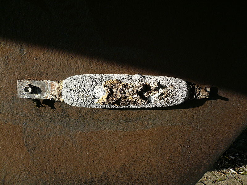 قطعة خارصين مُلتصقة بهيكل سفينة من الحديد . تأكسدَ الخارصين بينما بقي الحديد دون أيّ ضرر. أُخِذَت الصّورة من ويكيبيديا .