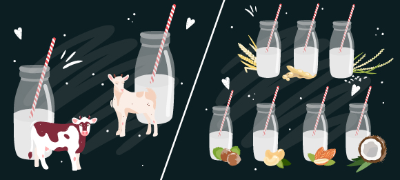 على اليسار حليب البقر وحليب الماعز، على اليمين مجموعة متنوعة من بدائل الحليب من النباتات: الشوفان، فول الصويا، الأرز، البندق، الكاجو، اللوز وجوز الهند | OllivsArt, Shutterstock