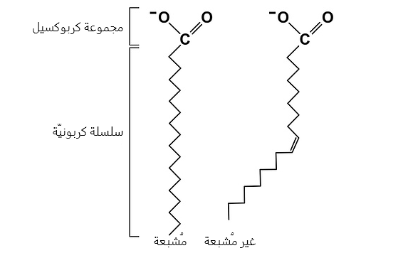 الدّهون المُشْبَعَة، إذًا، هي دهون ترتبط ذرّات الكربون فيها أيضًا بذرّات الهيدروجين – أي مُشْبَعَة بها – وبالتّالي لا يمكن لذرّات الكربون أن تشكّل روابط مزدوجة فيما بينها، بل روابط فرديّة فقط. من ناحية أخرى، تحتوي الدّهون غير المُشْبَعَة على رابطة مزدوجة واحدة على الأقلّ بين ذرّتين كربون متجاورتين. يسمّى الحمض الدّهنيّ الّذي يحتوي على رابطة مزدوجة واحدة "أحاديّة غير مُشْبَعَة"، في حين أنّ الرّوابط المزدوجة المتعدّدة تعطيه اسم "متعدّد غير مُشْبَع".