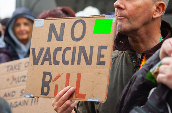 متظاهرون مؤمنون بنظرية مؤامرة بيل غيتس وبأنّ اللقاح يحوي رقاقاتٍ دقيقةً للتتبّع | المصدر: Shutterstock