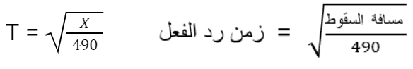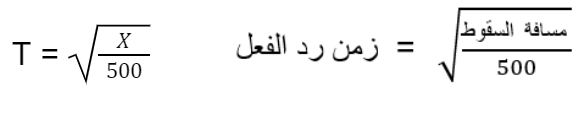 إذا قرّبنا تسارع السقوط الحر (g) إلى 10 متر في الثانية تربيع وتذكرنا أنه يجب التقسيم على 100 لتحويل السنتيمترات إلى أمتار، أي تقسيم الـ X على 100 (بما أن الـ g معطى بالأمتار، يجب أن يكون الـ X بنفس الوحدات)، سنحصل على المعادلة التي تم عرضها في مقطع الفيديو. يمكننا، عن طريق استعمال هذه المعادلة، أن نجد الزمن الذي استغرقه الجسم أثناء سقوطه، والذي هو بمنزلة زمن رد الفعل، بحسب مسافة السقوط.