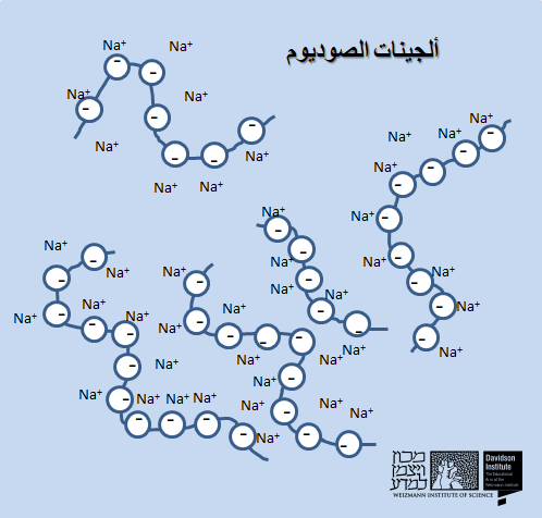 إذا أمعنّا النظر في التركيب الكيميائيّ الأساسيّ للألجينات، يمكننا التمييز بأنه في كل حلقة يوجد منطقة يُرمز لها بالإشارة السّالبة (-)، مما يدل على أنّ كل حلقة لها منطقة مشحونة بشحنة كهربائية سالبة، وبجوارها رمز Na +، رمز الصوديوم في ألجينات الصوديوم، المشحونة بشحنة كهربائية موجبة بالأساس (+ هو أيون موجب)، والذي يُوازن الشحنة السلبية الخاصة بالحلقات. يُشبه مبنى الألجينات في الأساس مادة ماصّة للماء تتواجد في الحفاظّات.