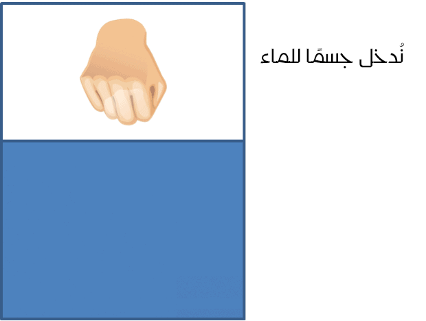 (1) عند إدخال الجسم إلى الماء فإنه يطرد ماءً بحسب حجمه (لأن الماء لا يمكن أن يُضغَط وينكمش)، و (2) تؤثر على الجسم قوة تدفعه إلى أعلى (قانون أرخميدس)، ولكن (3) بما أنه وبشكل طبيعي لكل فعل رد فعل يساويه في المقدار ويعاكسه في الاتجاه (قانون نيوتن الثالث)، فإنه يجب أن تكون هناك قوة تدفع الماء والوعاء إلى أسفل، وهي مساوية تماماً لقوة الطفو. لهذا السبب، عند وضع الميزان تحت النظام بأكمله، يمكننا قياس هذه القوة بسهولة، وبذلك نكون قد قمنا بقياس حجم قبضة اليد، حيث أنه في حال كان السائل ماءً كما في هذه التجربة، فإن الكتلة بالجرامات تكون مطابقة من حيث القيمة العددية للحجم، بالسنتيمترات المكعبة.
