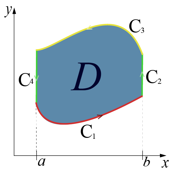 يربط بين التّكامل المطبَّق على محيط الشّكل والتّكامل الّذي يحسب المساحة المحصورة ضمنه. عرض بياني لنظريّة غرين | المصدر: ويكيميديا
