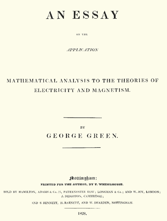 مقال غرين حول تطبيقات التحليل الرياضي لنظريات الكهرباء والمغناطيسية من عام ١٨٢٨| المصدر: ويكيميديا، للعامة