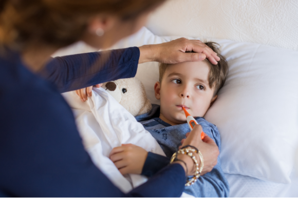 تشهد المستشفيات زيادة في الإشغال بسبب أمراض الشّتاء. طفل مريض يقيس درجة الحرارة | Ground Picture, Shutterstock