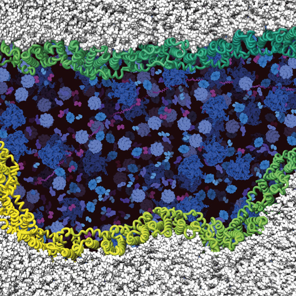 عمليّة تمزيق غشاء الخليّة بمشاركة بروتين "نينجورين-1" (ninjurin-1). تتجمّع بروتينات النينجورين-1 (أخضر-أصفر) وتشقّ غشاء الخليّة (رمادي)، محتويات الخليّة باللون الأزرق | المصدر: Biozentrum, University of Basel