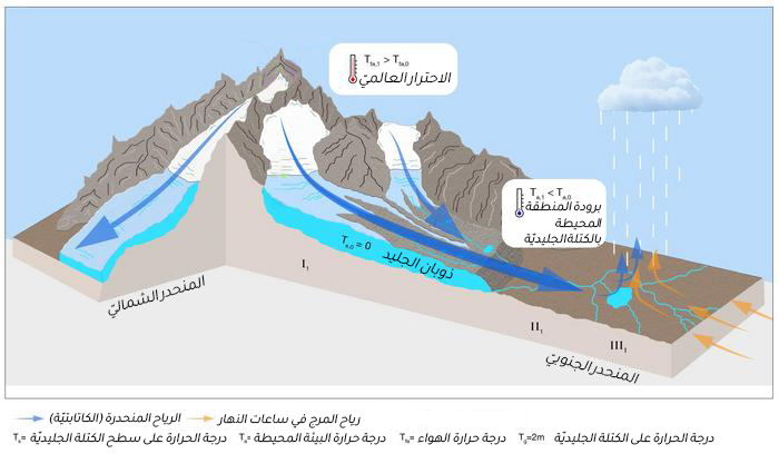 للرياح المنحدرة (الكاتابتيّة) دورها في هذه الحالة أيضًا. تُسمَّى المنطقة الّتي تلتقي فيها الريح المنحدرة الّتي تهبُّ نحو أسفل الجبل بالرياح الّتي تهبّ نحو أعلى الجبل بمنطقة التجمّع، وغالبًا ما تكثر فيها الرواسب. يعتقد الباحثون أنّ ازدياد شدة الريح المنحدرة يؤدّي إلى انتقال منطقة التجمّع الّتي في أسفل السلاسل الجبليّة. تتنقل الأمطار الّتي تتكوّن في منطقة التجمّع، نتيجة لذلك، باتّجاه أسفل الجبل هي الأخرى. وتقلّ بذلك كميّة الأمطار الّتي تهطل على الكثبان الجليديّة، ويقلّ الازدياد السنويّ في كتلة الجليد.