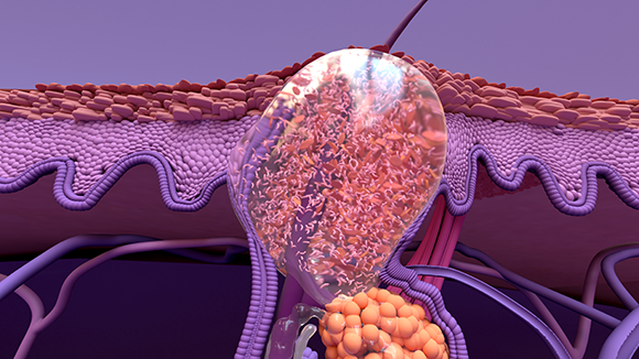 عند انسداد الغدّة الدهنيّة، تتطوّر الظروف المثاليّة لتكاثر بكتيريا الجلد. إحدى الطرق لمنع ذلك هي تقليل إنتاج الحليب. رسم توضيحيّ لما يحدث في غدّة الحليب المسدودة | Shutterstock, Design_Cells