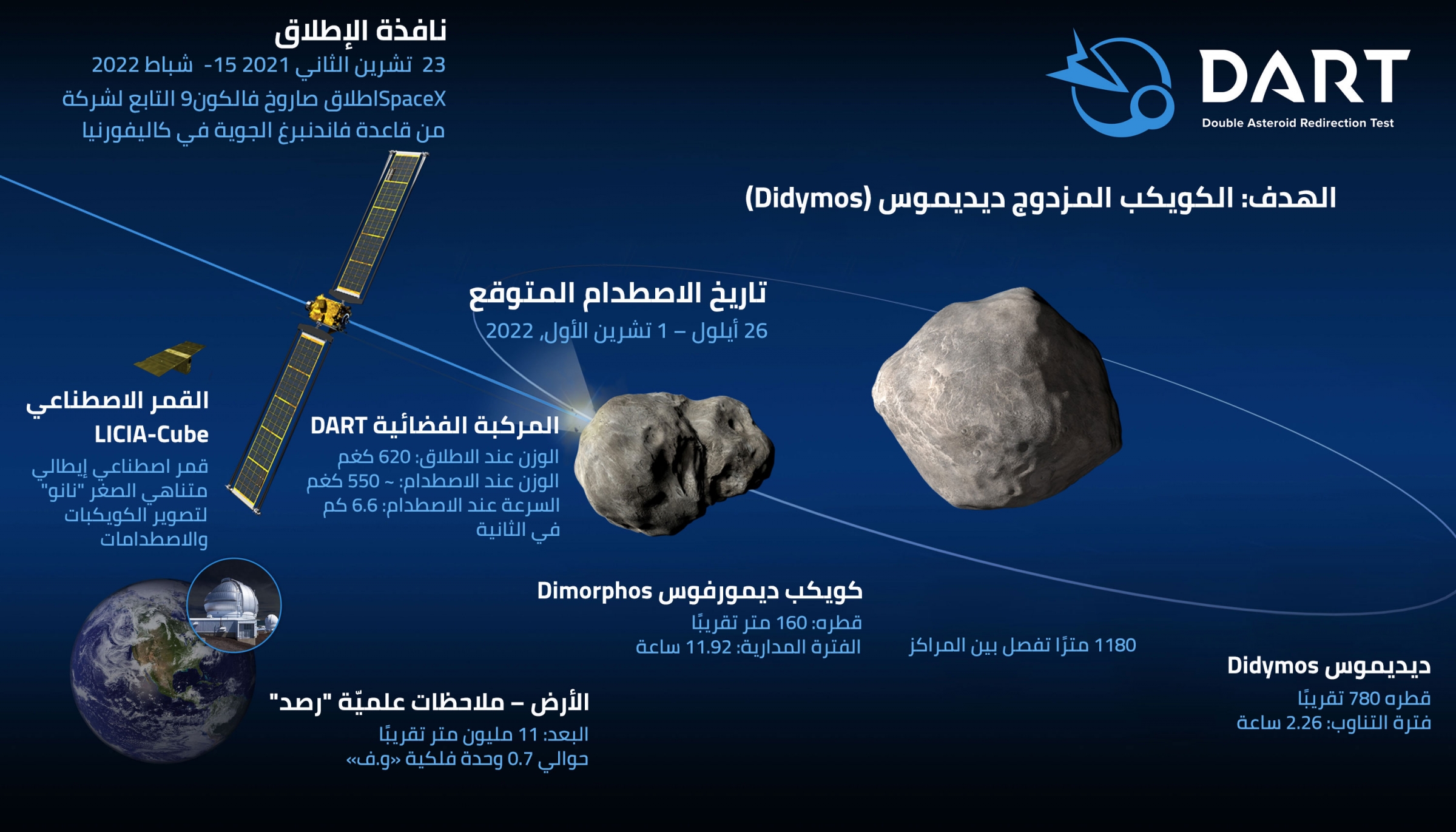 ملخّص مهمّة DART. اضغط هنا لتكبير الصورة | رسم: NASA/Johns Hopkins Applied Physics Lab