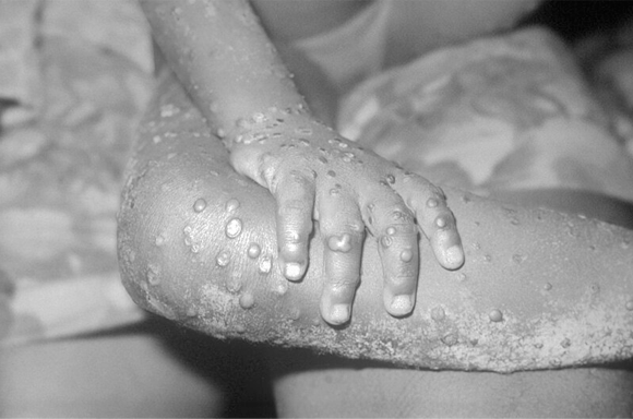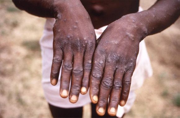 نداء تنبيه لحكومات العالم لتعزيز الأنظمة الصّحّيّة والعمل من أجل التّعاون الدّوليّ في جعل الاختبارات والعلاجات واللّقاحات أكثر سهولة. يد شخص مصاب بجدري القرود، الكونغو 1997| CDC/ Brian W.J. Mahy