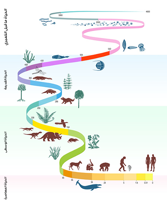 المحور الزمنيّ الجيولوجيّ وتطوّر الحياة على الكرة الأرضيّة. بدأ عصر البروتيروزويك قبل 2.5 مليار سنة تقريبًا واستمرّ إلى ما قبل نصف مليار سنة تقريبًا (باللون الزهريّ) | Gary Hincks / Science Photo Library