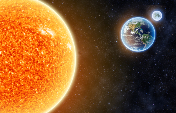 يؤثّر كلّ من الكرة الأرضيّة والقمر في بعضهما بِقوى وعزوم، و تؤثّر هذه في دورانهما. الكرة الأرضيّة والقمر يدوران حول الشمس | Aphelleon, Shutterstock