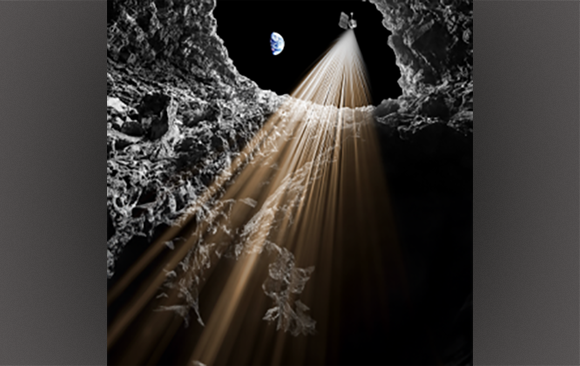 مؤشّرات أوّليّة لوجود مغارة أفقيّة لها فتحة خروج إلى سطح القمر | محاكاة: A. Romeo، بدمج مكوِّنات من صور لـِ NASA
