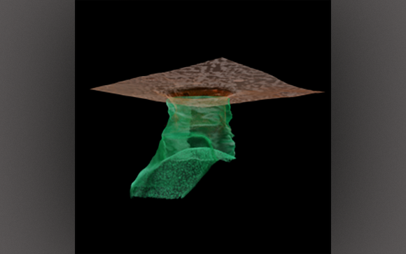 تبدأ المغارة من الأسفل. محاكاة ثلاثيّة الأبعاد للبئر العموديّة MTP، بالاعتماد على صور وقياسات أخذت بالأقمار الصناعيّة | المصدر: مقال البحث Lunar Pit Morphology: Implications for Exploration מאת R. V. Wagner, M. S. Robinson