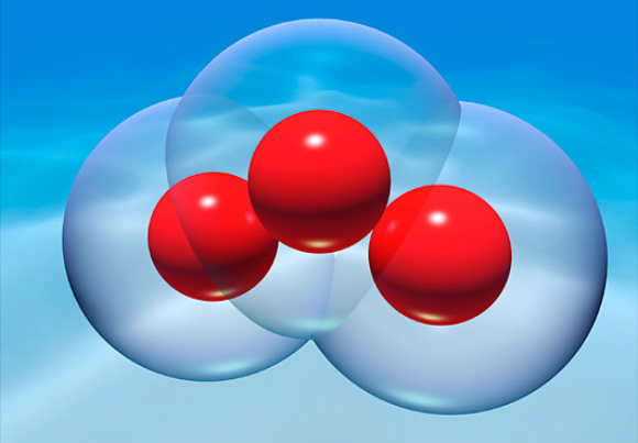 ينتج بواسطة الأشعّة فوق البنفسجيّة القادمة من الفضاء، ويحمينا منها. جزيء من غاز الأوزون، يتركّب من ثلاث ذرّات أوكسجين | رسم توضيحيّ: RUSSELL KIGHTLEY / SCIENCE PHOTO LIBRARY