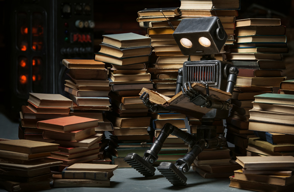 خلال عمليّة التّدريب، يعتمد الذّكاء الاصطناعيّ على مجموعة كبيرة من التّصنيفات القائمة لتعلّم التّعميم على الحالات الجديدة. روبوت على كومة من الكتب يقوم بقراءة كتاب |  Vasilyev Alexandr, Shutterstock