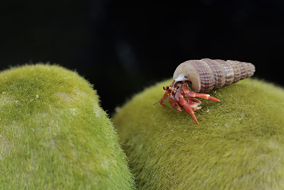 يتوجّب عليه الحصول على قوقعة فارغة ليعيش فيها. سلطعون النّاسك على حجر مغطّى بالطّحالب | صورة: I Wayan Sumatika, Shutterstock