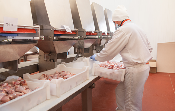 يبدو أنّ استهلاك الأغذية الحيوانية أكثر ضررًا للبيئة من استهلاك الأغذية النّباتيّة . عامل في مصنع تحضير الدّجاج | Nataliia Maksymenko, Shutterstock