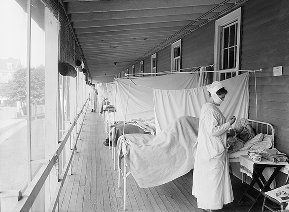 الوباء الّذي قتل بحسب التّقديرات خمسين مليون شخص. مَرضى الأنفلونزا الإسبانيّة يتمّ إدخالهم إلى المستشفى في العاصمة واشنطن، الولايات المتّحدة | Everett Collection, Shutterstock