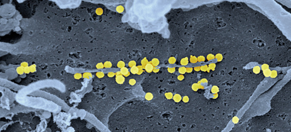 يسبّب الفيروس ارتفاعًا في درجة الحرارة، وعادة نزيفًا حادًّا بسبب تلف الأوعية الدّمويّة والقلب. فيروسات CCHF (الصّفراء) تخرج من خليّة مصابة | المصدر: National Institute Of Allergy And Infectious Diseases, National Institutes Of Health / Science Photo Library