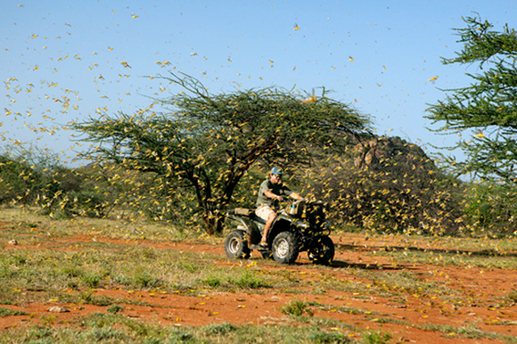 سربٌ ضخمٌ من الجراد يلتهم المحاصيل. مُزارِع وسط سرب من الجراد في كينيا | Adam Bannister / Greatstock / Science Photo Library