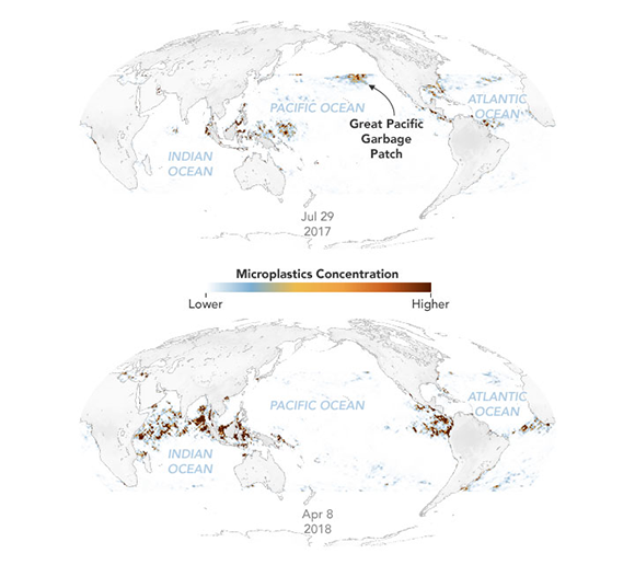 تمّ تجنيد الأقمار الصّناعيّة التابعة لوكالة الفضاء الأمريكيّة "ناسا" للحرب ضدّ البلاستيك، إذ يستخدمها العلماء لتتبّع انتشار جسيمات البلاستيك الدّقيقة، من الفضاء، حول العالم. حتّى الآن، تأتي معظم المعلومات حول موقع جسيمات البلاستيك الدّقيقة في المحيطات بشكل أساسيّ من الملاحظات والتّحاليل المحلّيّة لعيّنات المياه، الّتي لا تعكس بشكل كافٍ الصّورة الواسعة، حيث يصعب فهم ما هي الكمّيّة الحقيقيّة، وأين توجد أكبر تركيزات من جسيمات البلاستيك الدّقيقة. تستخدم الأقمار الصّناعيّة قياسات خشونة سطح الماء لاستنتاج سرعة الرّياح فوق الأمواج. يمكّن هذا القياس، أيضًا، من التّعرّف إلى جزيئات البلاستيك الّتي تطفو على الماء. تسبّب النّفايات الّتي تطفو على سطح المياه في خفض ارتفاع الأمواج وبالتّالي تقليل خشونة سطح البحر.