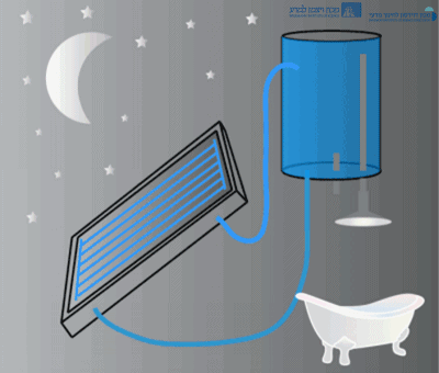 הסבר לאנימציה: השמש זורחת, מחממת את הקולטים ואת המים שבתוכם – צבע המים הופך מכחול לאדום. המים החמים ה"קלים" (הפחות צפופים) זורמים כלפי מעלה לחלק העליון של הדוד – ומים קרים חדשים נכנסים מהחלק התחתון של הדוד לתחתית הקולטים. כתוצאה מכך הדוד מתמלא לאט במים חמים. הזרימה בין הדוד לקולט מתרחשת מעצמה ללא צורך במשאבה בגלל הבדלי הצפיפויות בין מים קרים לחמים (מים חמים צפים על מים קרים). בערב – אפשר להתרחץ במים חמים (מהחלק העליון של הדוד). זכויות היוצרים של האנימציה שייכות למכון דוידסון לחינוך מדעי, מותר להשתמש תוך מתן קרדיט נאות.